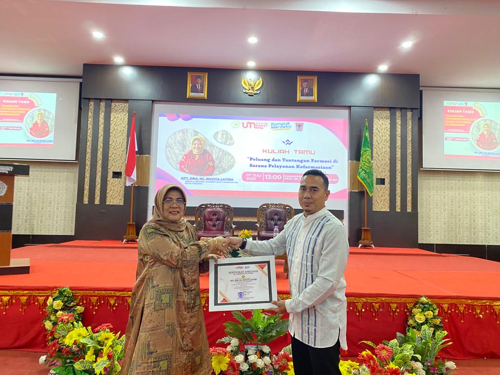 Fakultas Farmasi Universitas Muhammadiyah Sumatera Barat (UM Sumbar) mengadakan Kuliah Tamu dengan tema “Peluang dan Tantangan Farmasi di Sarana Pelayanan Kefarmasian” pada Jum’at, 7 Juli 2023 yang bertempat di Convention Hall Prof. Dr. Ahmad Safii Maarif, M.A Kampus 1 UM Sumbar, Padang. Kegiatan ini dihadiri oleh Dekan, Kaprodi, Perwakilan Dosen, Tenaga Kependidikan, dan seluruh Mahasiswa/i Farmasi UM Sumbar dengan menghadirkan narasumber dari Dinas Kesehatan Kota Padang yaitu Ibu Apt. Dra. Hj. Novita Latina, selaku Kepala Bidang Sumber Daya Kesehatan Kota Padang.